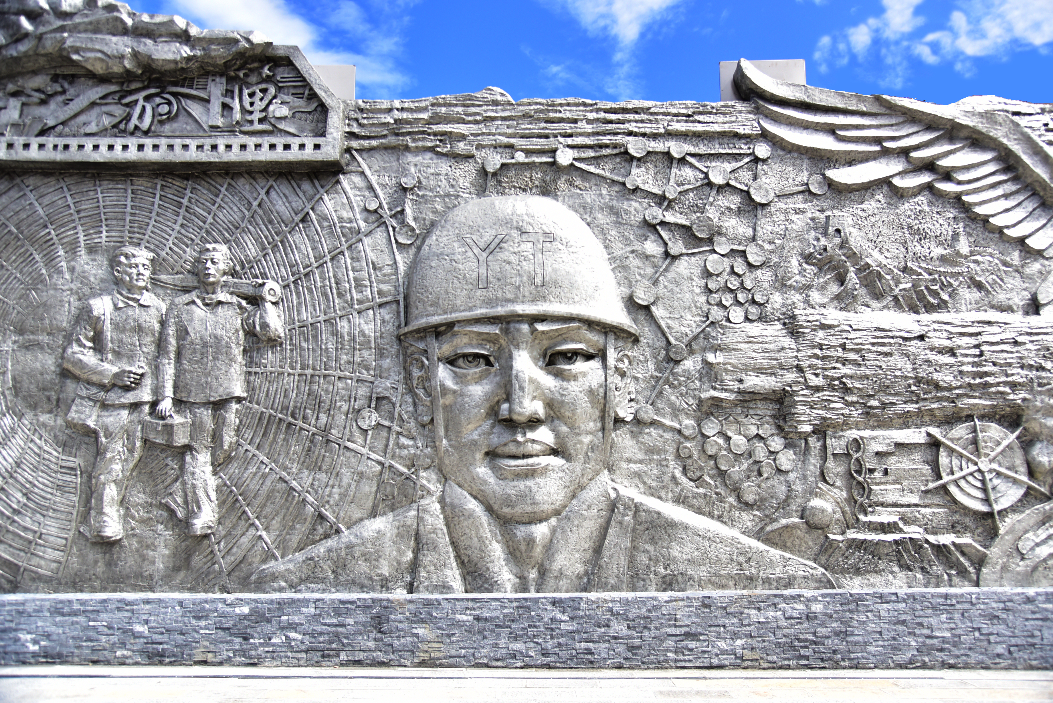 目光如炬的新時代云錫產業工人、盡顯家鄉民族文化的哈尼梯田、代表美譽濺滿中國乃至世界的錫水、艱苦創業的古時錫業人穿越時空走進新云錫、錫產品在高鐵和航天產品等行業的廣泛運用、助力云錫快速發展的大型工業設備、寓意云錫技術進步的齒輪、寓意云錫全球化發展的地球、寓意引領全球錫業而展翅高飛的雄鷹、高舉“YT”品牌以更寬視野注目著未來的云錫人……在以英文字母“T”為中軸的右側主題浮雕墻上,一組組極具真實感的畫面仿佛在描繪著 “云騰萬里”的豪邁。