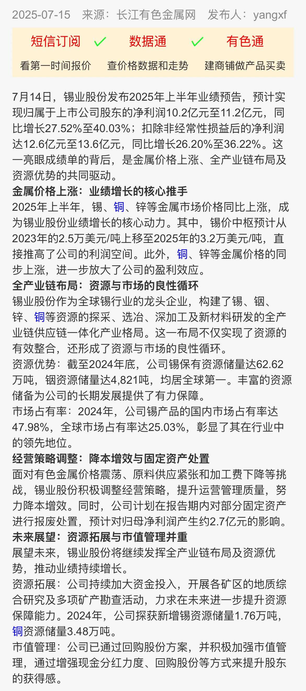 長江有色金屬網(wǎng):半年凈利破10億!金屬價格飆升+全產(chǎn)業(yè)鏈優(yōu)勢,錫業(yè)股份為何能領(lǐng)跑行業(yè)?