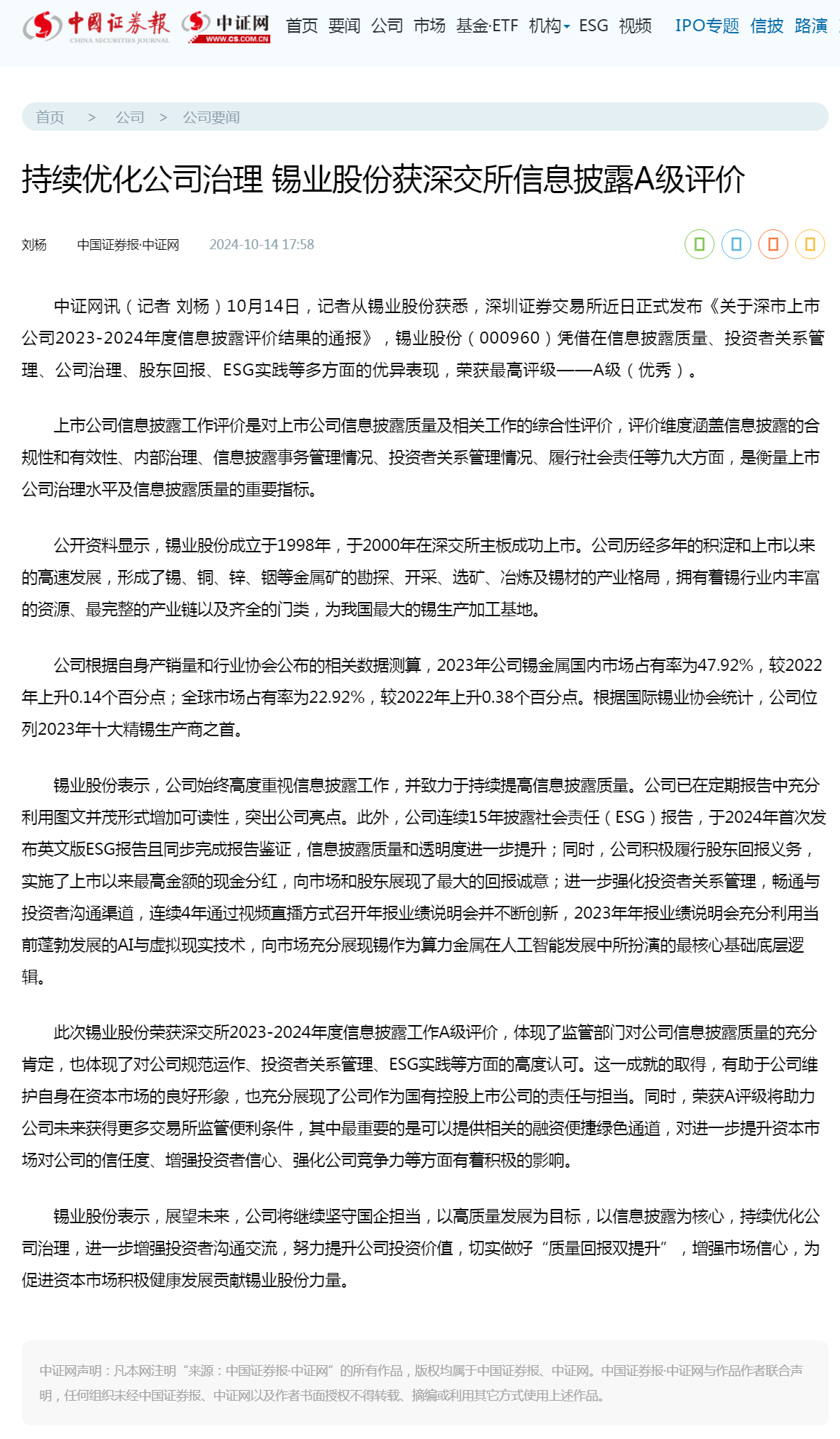 中證網:持續優化公司治理 錫業股份獲深交所信息披露A級評價