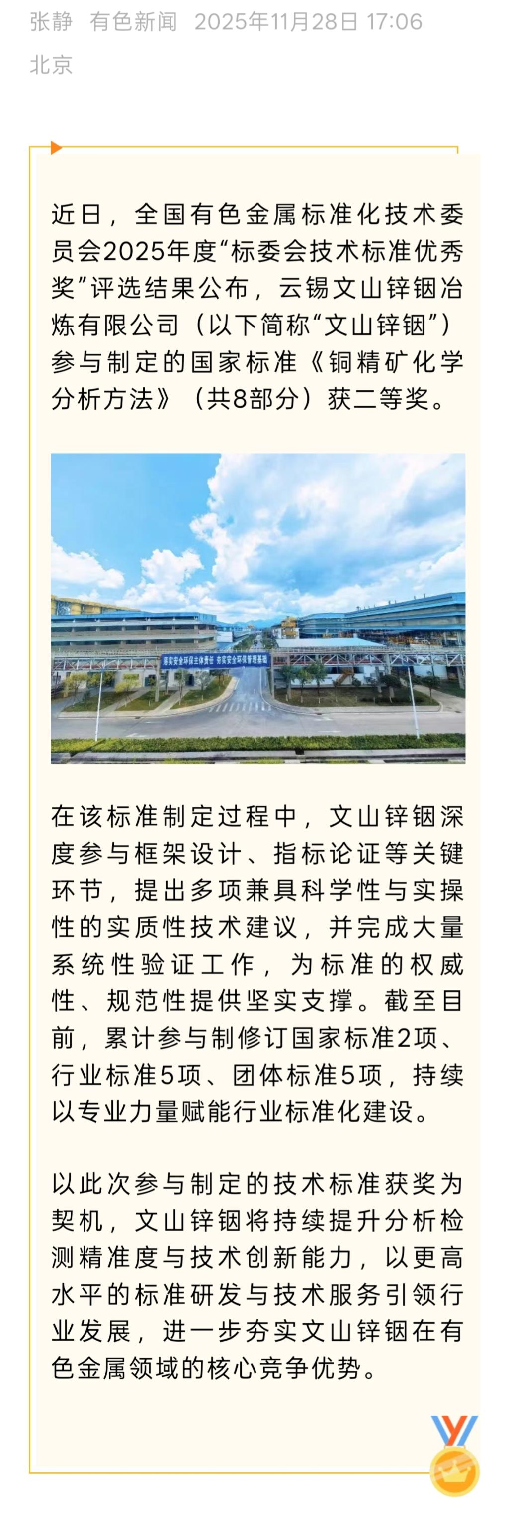 有色新聞:文山鋅銦參與制定的行業(yè)標(biāo)準(zhǔn)榮獲全國有色標(biāo)委會技術(shù)標(biāo)準(zhǔn)優(yōu)秀獎