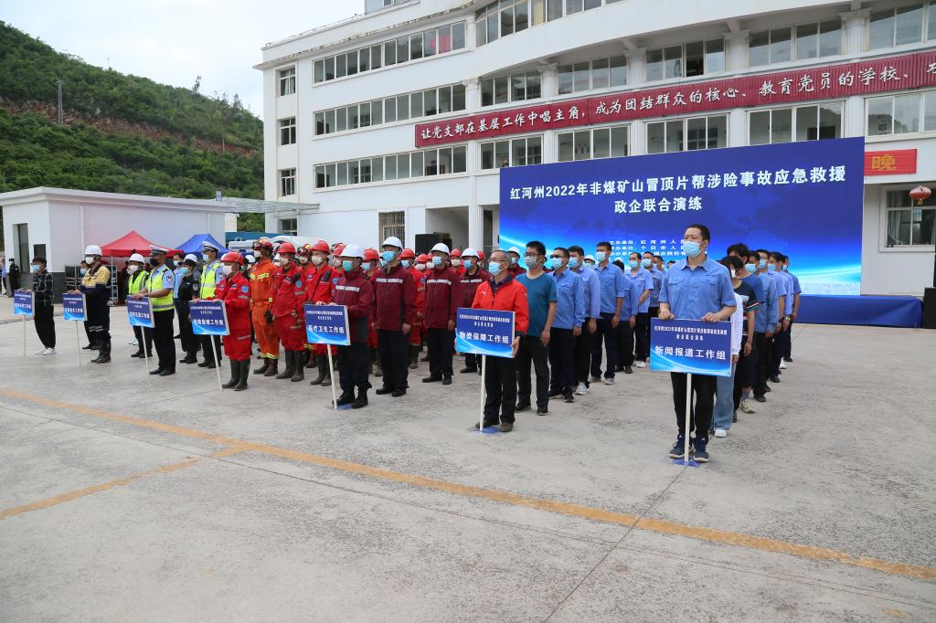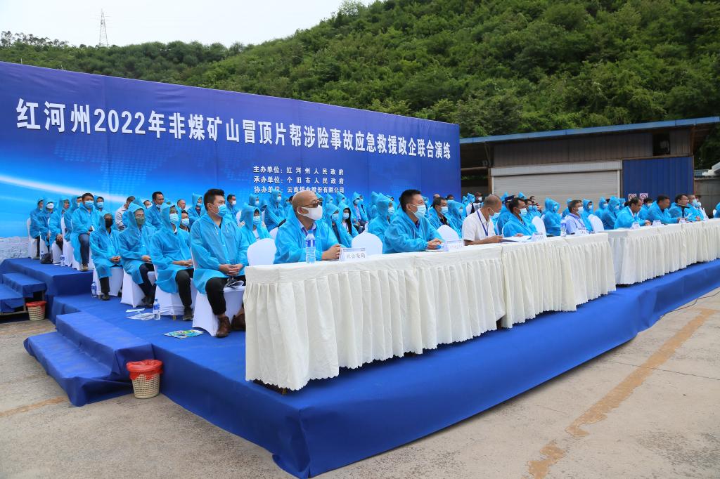 6月23日,由紅河州人民政府主辦、個舊市人民政府承辦、云南錫業股份有限公司協辦的紅河州2022年非煤礦山冒頂片幫涉險事故應急救援政企聯合演練在大屯錫礦舉行。認真學習貫徹落實習近平總書記關于安全生產重要論述,推動各級應急管理責任落實,壓實安全生產責任,切實提高紅河州非煤礦山事故應急救援能力。紅河州人民政府副秘書長楊克平,紅河州應急管理局局長張錳,錫業股份黨委副書記、董事長、總經理劉路坷錫業股份黨委委員、副總經理王建偉,錫業股份黨委委員、大屯錫礦黨委書記、經理王壽安等出席演練活動。